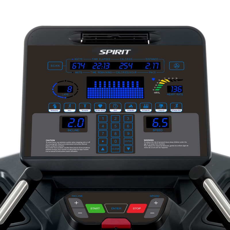 - 内设程序:手动,四种默认程序(爬坡,脂肪燃烧,心肺 功能,休息间隔),5K 跑步,心率控制,高强度间歇训练(HIIT)和九健身测试协议